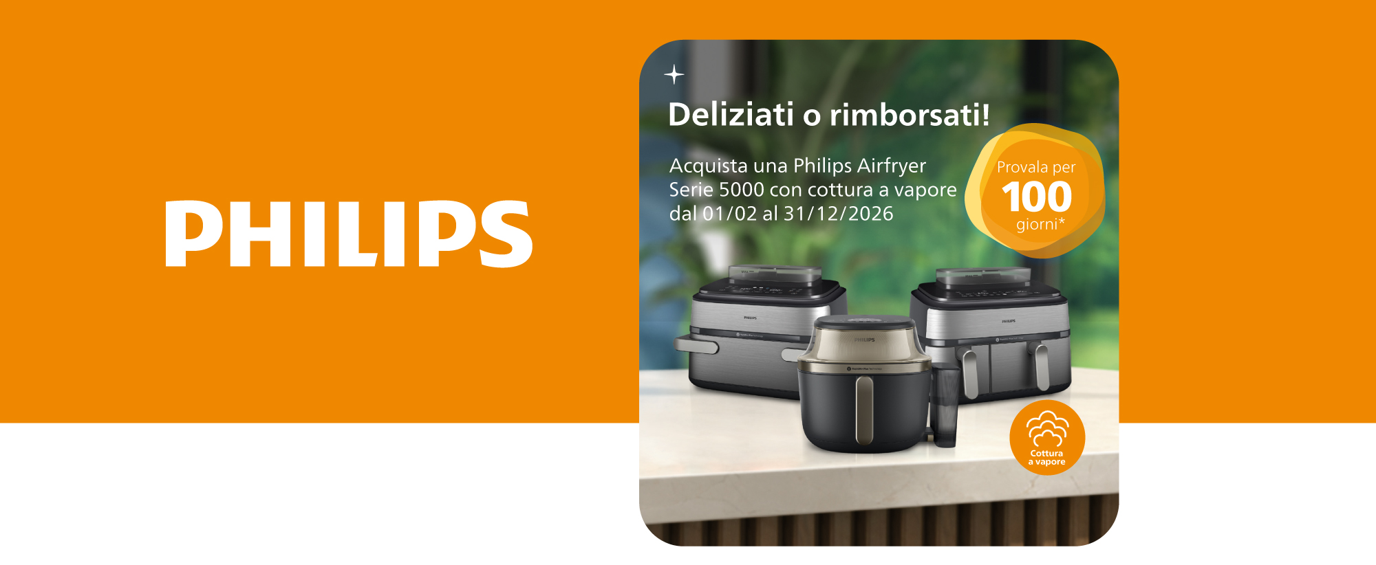 Dal 01/02/2026 al 31/12/2026 acquista una Airfryer serie 5000 tra quelle coinvolte e conserva il documento d’acquisto e la confezione del prodotto